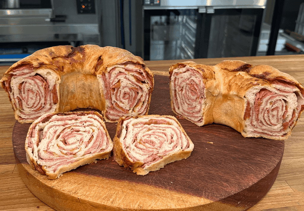 Este pão contém na massa açafrão da terra, e uma deliciosa linguiça artesanal. É o pão mais replicado pelos alunos.